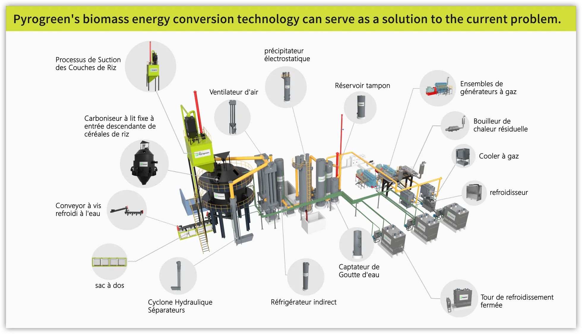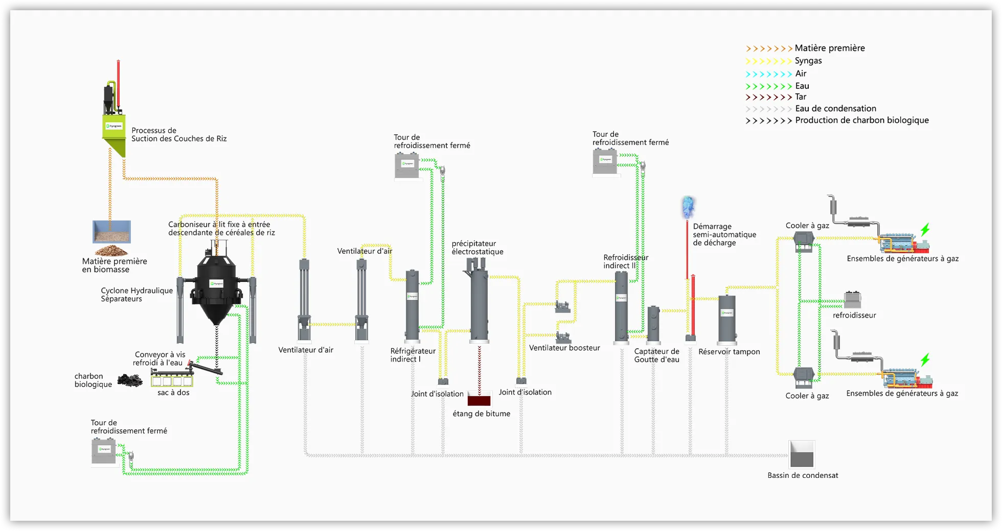 Les déchets agricoles et forestiers tels que les copeaux de bois, les blocs de paille, les copeaux de bambou, les épis de maïs, les coques de noix de coco, les granulés de biomasse et autres biomasses subissent une réaction de pyrolyse-gazéification dans le gazéifieur avec un apport en oxygène pauvre, produisant du gaz combustible et du biochar. Il est ensuite utilisé comme carburant dans un moteur à gaz pour produire de l'électricité. Le biochar est utilisé dans notre vie quotidienne, la production industrielle et agricole.