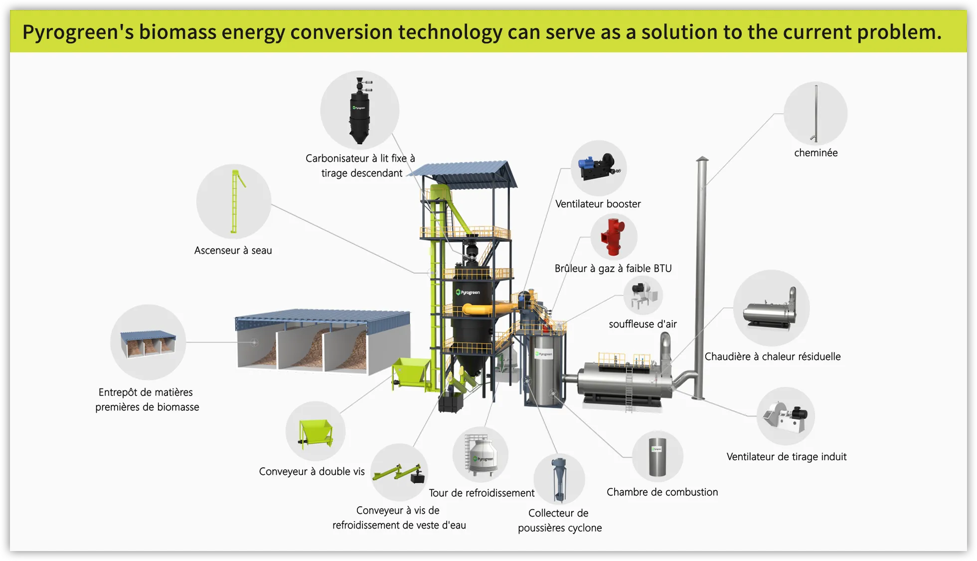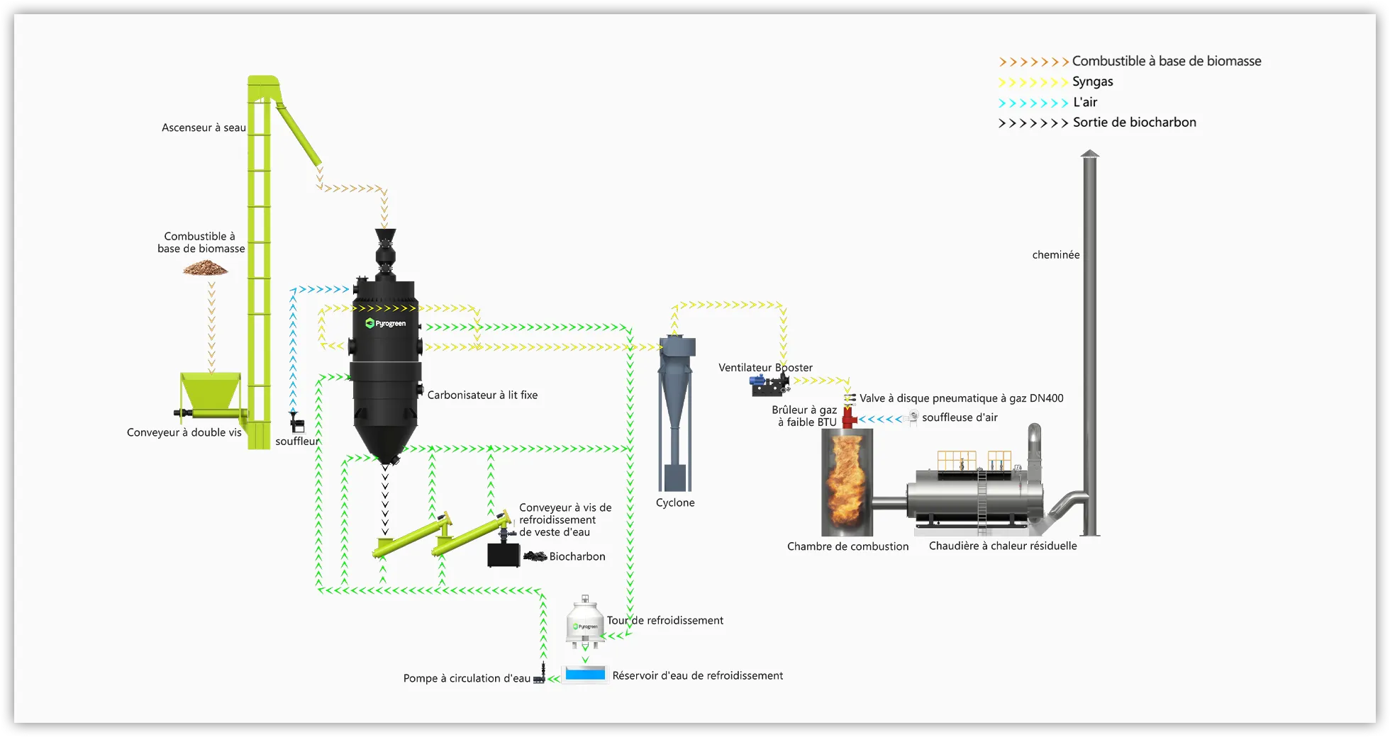 Les déchets agricoles et forestiers tels que les copeaux de bois, les blocs de paille, les copeaux de bambou, les épis de maïs, les coques de noix de coco, les granulés de biomasse et autres biomasses subissent une réaction de pyrolyse et de gazéification dans le gazéifieur avec un apport d'oxygène pauvre, produisant du gaz combustible et du biochar. Le gaz combustible converti à partir de la biomasse est directement canalisé et brûlé dans le four adiabatique pour produire des gaz de combustion chauds dont la chaleur est échangée dans une chaudière de récupération pour produire de la vapeur (eau chaude) à usage résidentiel ou industriel. Le biochar est utilisé dans notre vie quotidienne, dans la production industrielle et agricole.