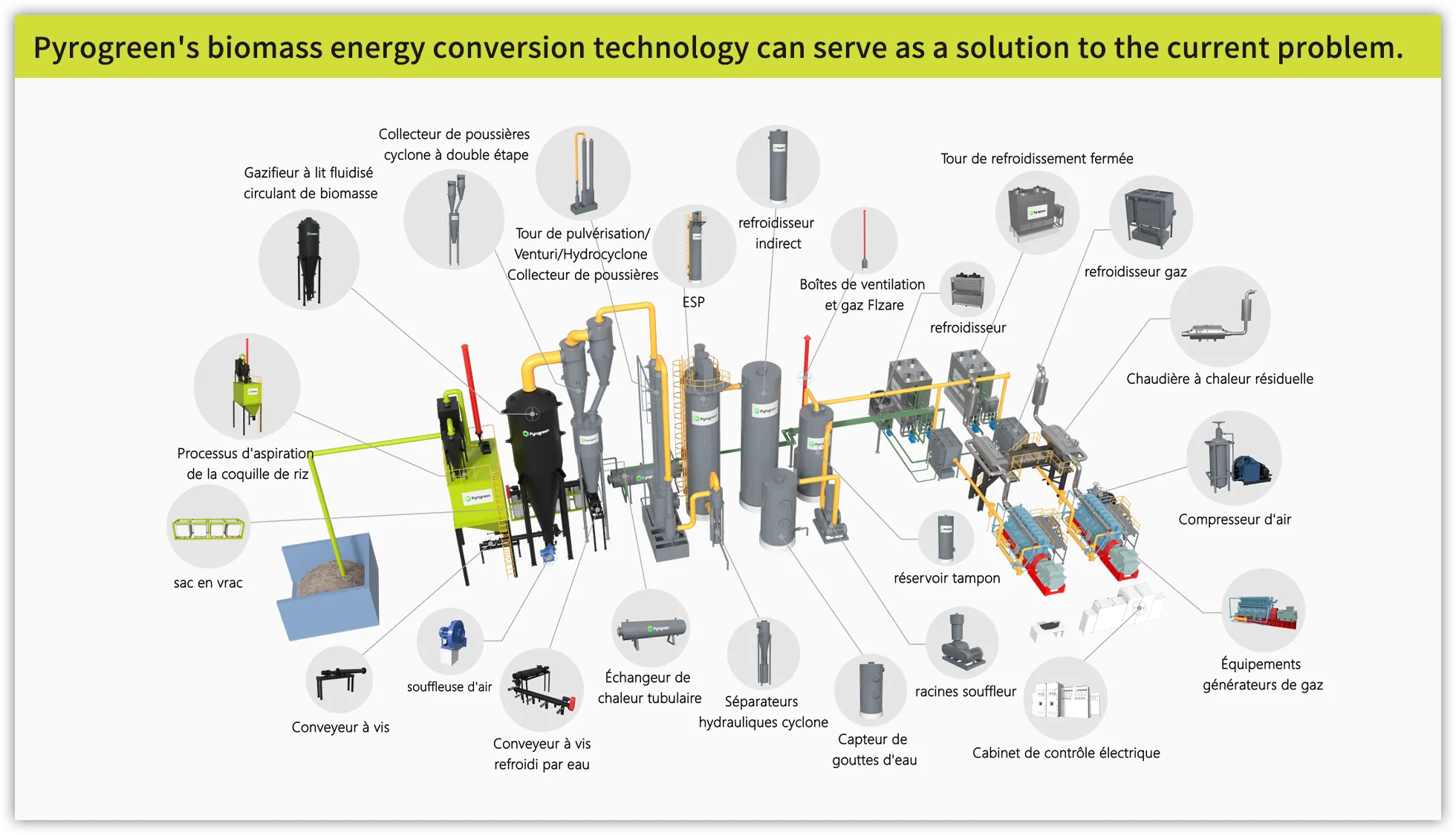 Les déchets agricoles et forestiers tels que les copeaux de bois, les blocs de paille, les copeaux de bambou, les épis de maïs, les coques de noix de coco, les granulés de biomasse et autres biomasses subissent une réaction de pyrolyse et de gazéification dans le gazéifieur avec un apport d'oxygène pauvre, produisant du gaz combustible et du biochar. Il est ensuite utilisé comme combustible dans un moteur à gaz pour produire de l'électricité. Le biochar est utilisé dans notre vie quotidienne, dans la production industrielle et agricole.