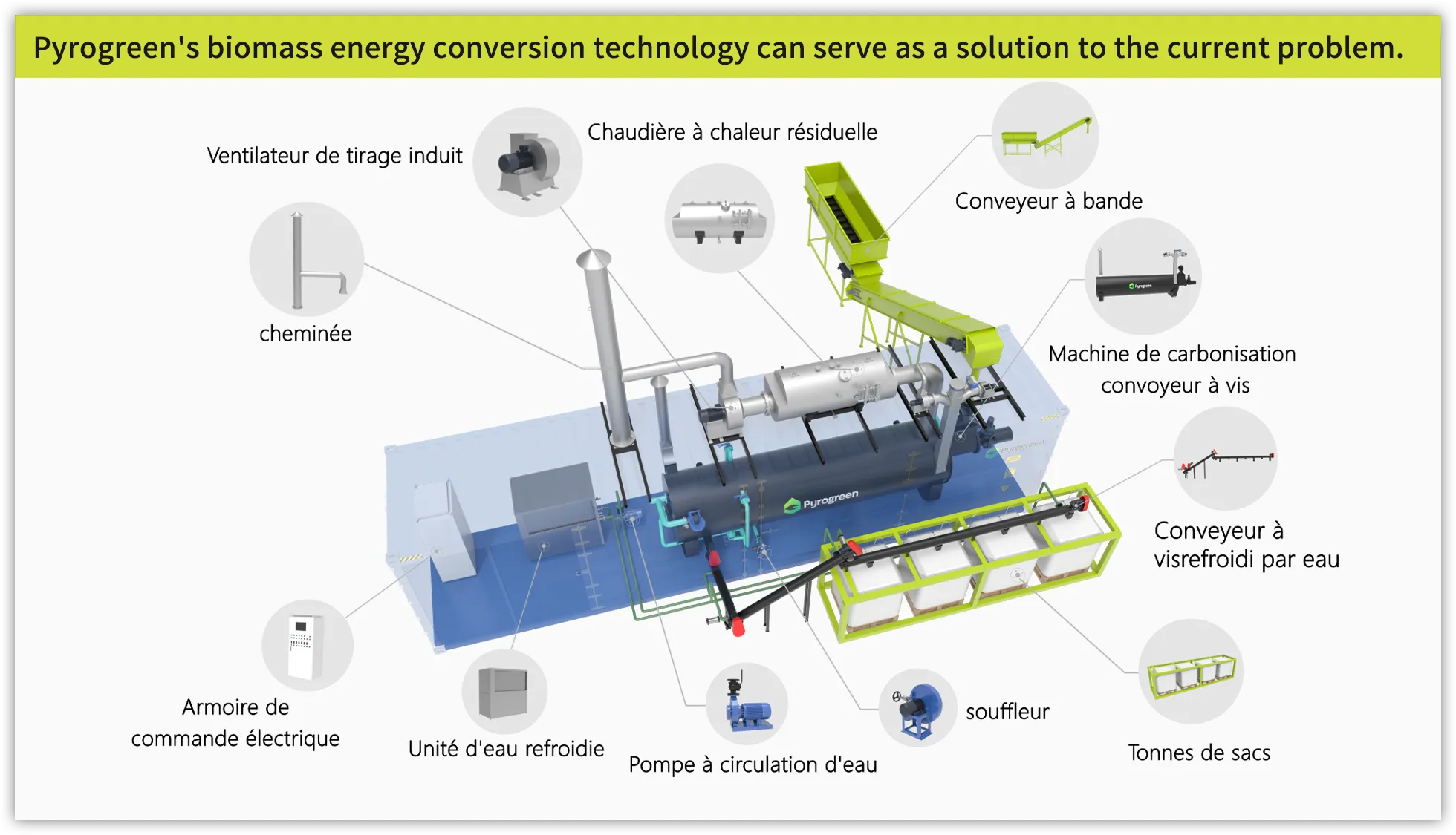 Haute efficacité thermique et production de biochar de haute qualité et en grande quantité.
